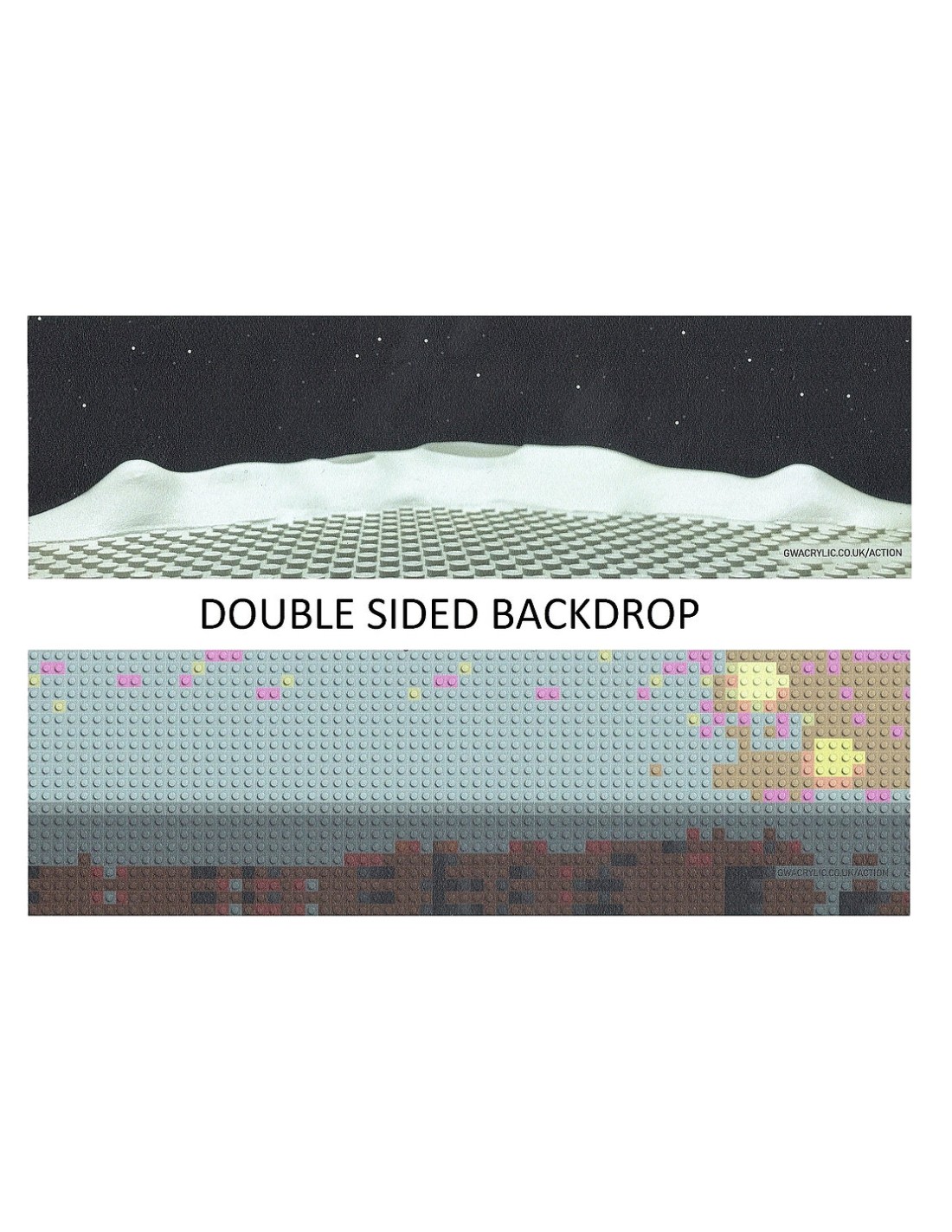 Ebenfalls im Lieferumfang enthalten ist ein Backdrop, welches die 2 Sonnen von Tatooine zeigt oder wahlweise eine Vintage Lego Space Bodenplatte.
